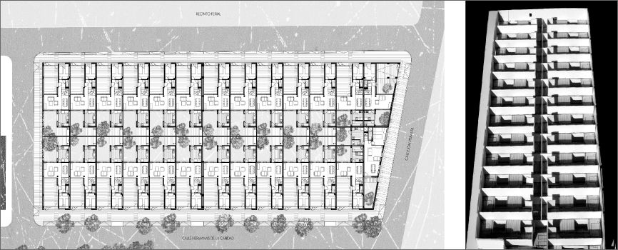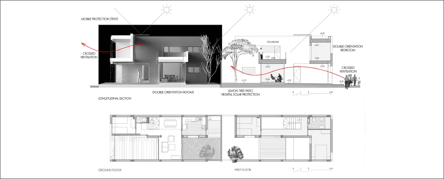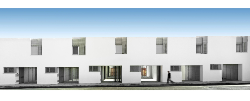 The project for the building of 26 Bioclimatic Social Houses in Umbrete aims to define two key concepts at the same time: the standard house and the global image of the intervention, as well as the relation of both with the urban context. Our purpose is to exploit the available surface completely, without leaving any space unused. This with a series of full and empty volumes, establishing a close connection between each other and defining the whole project. The standard House is repeated always the same, slightly modified only to be adapted to the irregular shape of one side of the plot, generating this way some modifications to the standard model of this social Andalusian houses. The global image is almost not affected by these differences. It allows the formalization of a project where from the outside you just note the different cells by which it is composed, and offers a vision of unity and an image that dialogues with the urban path, living harmoniously with the examples of traditional domestic architecture. A first reading of the external elevations offers a compact image, almost bi-dimensional: measured windows on the first floor and large openings on the ground floor, veiled with an aluminium mash protecting from external glances. Inside the house, on the contrary, full volumes follow up empty ones. Internal and external at the same time, alternating each others, surrounding and surrounded, playing with lights and shadows which are sliding on the walls. The entrance to each house is possible passing through a covered space, which can be used as well as a parking, opening towards the road on one side, and on a patio on the other. This first sequence between "full and empty" generates the threshold between public and private sectors. In front of us the living room opens to the first patio. This space separates and limits the second, more private and hidden patio -the lemon tree patio-, to which the kitchen overlooks. The stairs rise up filling a double height area vertically combining the two floors, leading to a walkway that horizontally connects the bedrooms and a sun terrace, located above the living room. The "voids" of the house, internal or external, are essential in the comprehension of the project. Along with "full", both create the space of life in the house. The main planning effort was directed towards a passive energy operating of the buildings, since the construction costs of only 526,00 Euro/m² and the sale price of 68.355,00 Euro for each house, made impossible the installation of active technology systems. The structure simplicity, and the use of materials easily available on site and well-known by local building workers, have been the central choices; big thermal mass in the foundation, walls and roofs in vaults, allow us to isolate from heat in summer and from cold in winter. The proposed distribution, despite of the unlucky orientation of the plot, allows us to have living rooms and main bedrooms with one side towards the south and the other to the north, as well as taking advantage of a natural cross-ventilation, both fundamental aspects in the climate of southern Spain. Letting the sun come in, taking advantage of the seasonal variation of its angle of incidence, and protecting ourselves with vegetation and typical regional horizontal awnings during the summer, promote a huge quality of the built space. Starting from the project data and carefully analyzing the context, introducing elements of sustainability, necessary but not sufficient in itself (materials, longevity, energy balance, passive use of environmental, natural light, natural ventilation, orientation, volumes, etc.), we achieve the most advantageous welfare housing, limiting the consumption and waste. The architecture is a great amalgam of elements that must work together (structure, technical installations, economy, passive end active systems, etc.) towards a constructive global act, without forgetting that we have to reach a formal and aesthetical richness too, a fundamental aspect in our work.Promoting and building a sustainable architecture in this century could be a great opportunity for a new revolution in architecture.